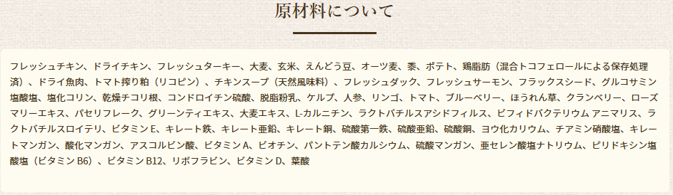 ◆原材料:鶏肉、七面鳥肉、鶏肉ミール、鮭ミール、大麦、全玄米、鶏肉脂肪(混合トコフェロールによる保存処理済)、オート麦、雑穀、ジャガイモ、乾燥全卵、トマト 絞滓、鮭肉、亜麻種子、天然鶏肉香料、塩化コリン塩酸塩、乾燥チコリ根、グルコサミン塩酸塩、タウリン、コンドロイシンサルフェート、ケルプ、にんじん、 えんどう豆、りんご、トマト、ブルーベリー、ほうれんそう、クランベリー粉、ローズマリーエキス、パセリフレーク、ユッカシジゲラエキス、緑茶エキス、大 麦エキス、L-カルニチン、エンテロコッカスフェシウム、カセイ菌、乾燥乳酸菌、サッカロミケス 発酵溶解物、乾燥麹菌発酵エキス、ビタミンE、鉄プロ テイン、亜鉛プロテイン、銅プロテイン、硫酸鉄、硫酸亜鉛、硫酸銅、ヨウ素酸カリウム、チアミン・モノニトレート、マンガンプロテイン、酸化マンガン、ア スコルビン酸、ビタミンA、ビオチン、パントテン酸カルシウム、硫酸マンガン、亜セレン酸塩ナトリウム、ビタミンB6、ビタミンB-12、リボフラビン、 ビタミンD、葉酸