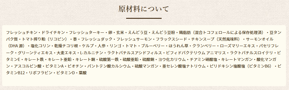 | ●政府機関の厳重な管理で生産しているから安心● ●素材は人間の食品基準で原材料を厳選● ●人工添加物不使用● |