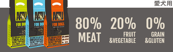 | 肉(魚)80%(愛犬用)/85%(愛猫用)と 20%(愛犬用)/15%(愛猫用)の野菜、 フルーツ、ハーブ、植物由来原料をふんだんに使用した 100%ナチュラルなグレインフリー(穀物不使用) ドッグフード&キャットフードです。 |