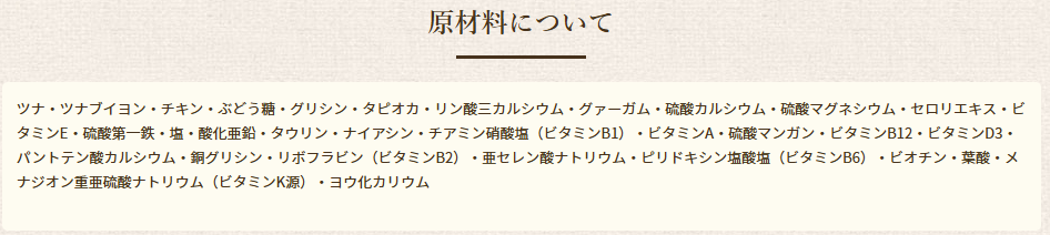 ツナ・ツナブイヨン・チキン・ぶどう糖・グリシン・タピオカ・リン酸三カルシウム・グァーガム・硫酸カルシウム・硫酸マグネシウム・セロリエキス・ビタミンE・硫酸第一鉄・塩・酸化亜鉛・タウリン・ナイアシン・チアミン硝酸塩(ビタミンB1)・ビタミンA・硫酸マンガン・ビタミンB12・ビタミンD3・パントテン酸カルシウム・銅グリシン・リボフラビン(ビタミンB2)・亜セレン酸ナトリウム・ピリドキシン塩酸塩(ビタミンB6)・ビオチン・葉酸・メナジオン重亜硫酸ナトリウム(ビタミンK源)・ヨウ化カリウム