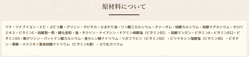 ツナ・ツナブイヨン・エビ・ぶどう糖・グリシン・タピオカ・ひまわり油・リン酸三カルシウム・グァーガム・硫酸カルシウム・硫酸マグネシウム・セロリエキス・ビタミンE・硫酸第一鉄・酸化亜鉛・塩・タウリン・ナイアシン・チアミン硝酸塩(ビタミンB1)・硫酸マンガン・ビタミンA・ビタミンB12・ビタミンD3・銅グリシン・パントテン酸カルシウム・亜セレン酸ナトリウム・リボフラビン(ビタミンB2)・ピリドキシン塩酸塩(ビタミンB6)・ビオチン・葉酸・メナジオン重亜硫酸ナトリウム(ビタミンK源)・ヨウ化カリウム