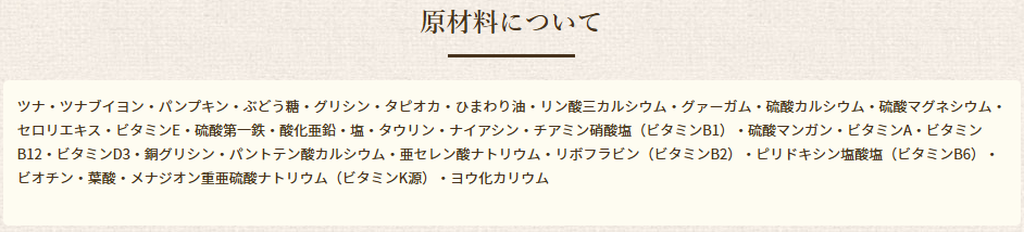 ツナ・ツナブイヨン・パンプキン・ぶどう糖・グリシン・タピオカ・ひまわり油・リン酸三カルシウム・グァーガム・硫酸カルシウム・硫酸マグネシウム・セロリエキス・ビタミンE・硫酸第一鉄・酸化亜鉛・塩・タウリン・ナイアシン・チアミン硝酸塩(ビタミンB1)・硫酸マンガン・ビタミンA・ビタミンB12・ビタミンD3・銅グリシン・パントテン酸カルシウム・亜セレン酸ナトリウム・リボフラビン(ビタミンB2)・ピリドキシン塩酸塩(ビタミンB6)・ビオチン・葉酸・メナジオン重亜硫酸ナトリウム(ビタミンK源)・ヨウ化カリウム