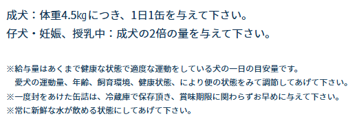成犬 : 体重4.5kgにつき、1日1缶を与えて下さい。