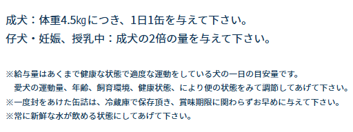 成犬 : 体重4.5kgにつき、1日1缶を与えて下さい。