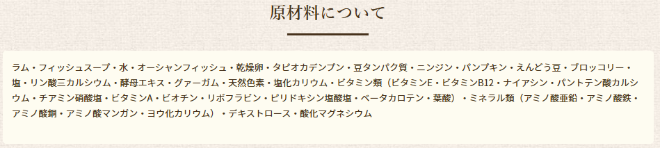 ラム・フィッシュスープ・水・オーシャンフィッシュ・乾燥卵・タピオカデンプン・豆タンパク質・ニンジン・パンプキン・えんどう豆・ブロッコリー・塩・リン酸三カルシウム・酵母エキス・グァーガム・天然色素・塩化カリウム・ビタミン類(ビタミンE・ビタミンB12・ナイアシン・パントテン酸カルシウム・チアミン硝酸塩・ビタミンA・ビオチン・リボフラビン・ピリドキシン塩酸塩・ベータカロテン・葉酸)・ミネラル類(アミノ酸亜鉛・アミノ酸鉄・アミノ酸銅・アミノ酸マンガン・ヨウ化カリウム)・デキストロース・酸化マグネシウム