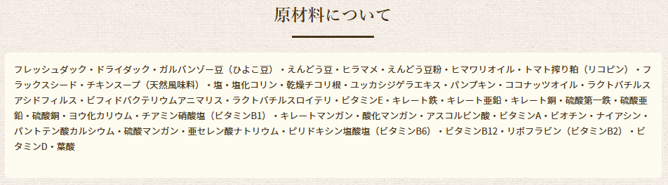フレッシュダック・ドライダック・ガルバンゾー豆(ひよこ豆)・えんどう豆・ヒラマメ・えんどう豆粉・ヒマワリオイル・トマト絞り粕(リコピン)・フラックスシード・チキンスープ(天然風味料)・塩・塩化コリン・乾燥チコリ根・ユッカシジゲラエキス・パンプキン・ココナッツオイル・ラクトバチルスアシドフィルス・ビフィドバクテリウムアニマリス・ラクトバチルスロイテリ・ビタミンE・キレート鉄・キレート亜鉛・キレート銅・硫酸第一鉄・硫酸亜鉛・硫酸銅・ヨウ化カリウム・チアミン硝酸塩(ビタミンB1)・キレートマンガン・酸化マンガン・アスコルビン酸・ビタミンA・ビオチン・ナイアシン・パントテン酸カルシウム・硫酸マンガン・亜セレン酸ナトリウム・ピリドキシン塩酸塩(ビタミンB6)・ビタミンB12・リボフラビン(ビタミンB2)・ビタミンD・葉酸