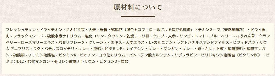 ◆原材料:フレッシュチキン・ドライチキン・えんどう豆・大麦・米糠・鶏脂肪(混合トコフェロールによる保存処理済)・チキンスープ(天然風味料)・ドライ魚肉・フラックスシード・硫酸水素ナトリウム・塩化コリン・タウリン・乾燥チコリ根・ケルプ・人参・リンゴ・トマト・ブルーベリー・ほうれんそう・クランベリー・ローズマリーエキス・パセリフレーク・グリーンティエキス・大麦エキス・L‐カルニチン・エンテロコッカスフェシウム・ラクトバチルスカゼイ・ラクトバチルスアシドフィルス・サッカロミセス発酵溶解物・乾燥麹菌発酵エキス・亜鉛タンパク質・ビタミンE・ナイアシン・マンガンタンパク質・銅タンパク質・硫酸亜鉛・硫酸マンガン・硫酸銅・チアミン硝酸塩・ビタミンA・ビオチン・ヨウ化カリウム・パントテン酸カルシウム・リボフラビン・ピリドキシン塩酸塩(ビタミンB6)・ビタミンB12・酸化マンガン・亜セレン酸塩ナトリウム・ビタミンD・葉酸