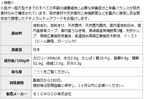 小型犬〜超大型犬まで全ての年齢の健康維持に必要な栄養成分と栄養バランスが自然食材のみで構成されています。
