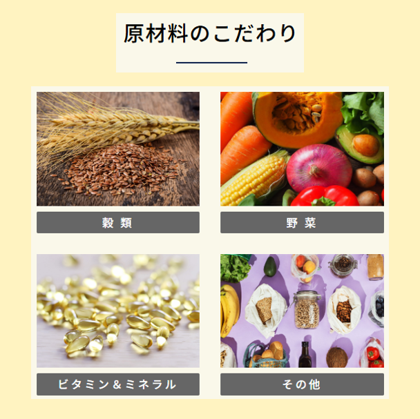 | ●化学薬品や合成添加物、グルテン等一切不使用 ●酵素、ビタミン、プロバイオティクスは非加熱にて配合 ●日本国内にて全量検査、最終仕上げ ●高気密・脱酸素方式包装により合成保存料に頼らず保存性を確保 |