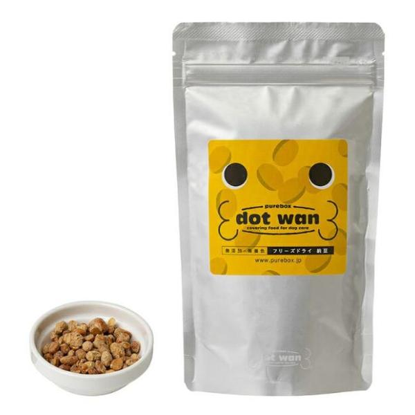 栄養豊富で整腸作用の高い納豆は、ワンコの身体にとても良い食品。実はワンコの大好物でもあります。ドットわんでは"生きた納豆菌"を届けたいという想いから、ワンコ用に熟成度合を高めた良質な納豆をフリーズドライ加工しました。サラリとした手触りで与えやすい、ドットわん不動のロングセラー商品です。