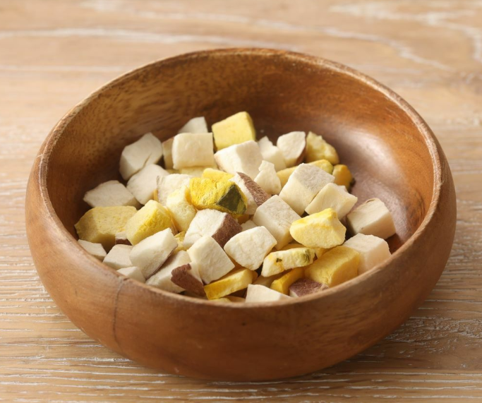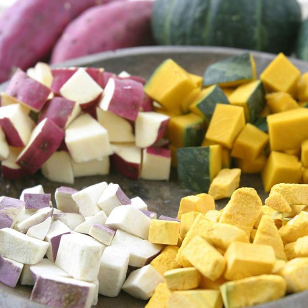 | カットした国産のかぼちゃとサツマイモを、蒸かして甘みを引き出し、フリーズドライ加工でサクサク食感に仕上げました。かぼちゃとサツマイモは共に身体の調子を整えてくれる食物繊維とビタミン類が豊富な食材。他の野菜に比べクセも少なく、甘みがあるので、野菜を食べ慣れていないワンコにもおすすめです。 |