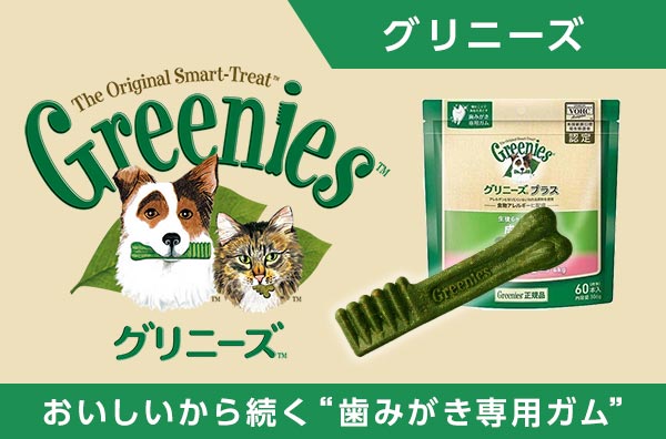 *グリニーズを与える場合は、飲み込まずによく噛んでいるかを見守り、飼い主の責任のもとに与えてください。