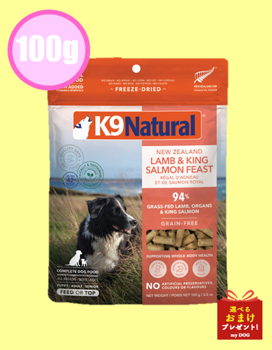 子羊肉、鮭、グリーントライプ(子羊)、肺(子羊)、肝臓(子羊)、腎臓(子羊)、心臓(子羊)、フラックスシードフレーク、にんじん、ニュージーランド緑イ貝、骨(子羊)、かぼちゃ、ひまわり油、ブロッコリー、乾燥昆布、リン酸二カリウム、ビタミンE、塩化ナトリウム、ミネラル類(プロティネイト亜鉛、プロティネイト鉄、酸化マグネシウム、セレン酵母、プロティネイト銅、プロティネイトマンガン)、ビタミン類(ビタミンB1、ベータカロチン、葉酸、ビタミンD3)
