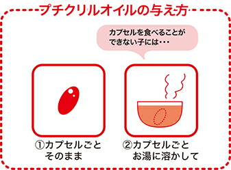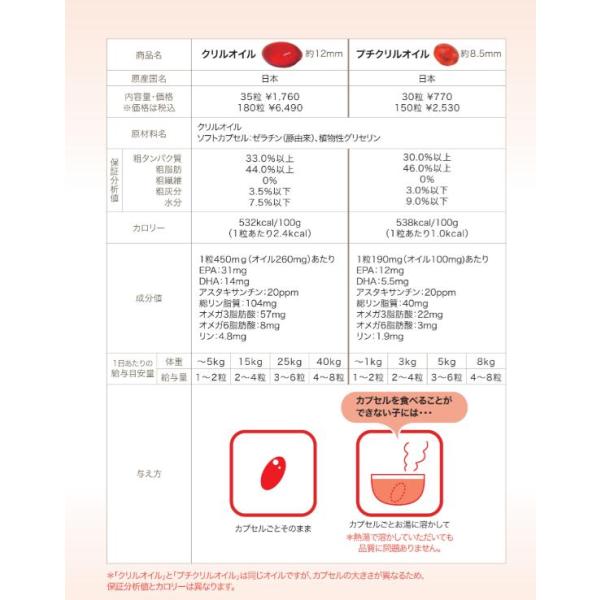 | 来の「クリルオイル」と比較して約30%小さくなった「プチクリルオイル」。直径約8.5ミリの小サイズは、口の小さなワンちゃんにも飲みやすい |