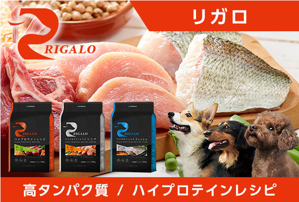 | リガロは、ラム、ターキー、フィッシュ3種類のお肉に様々な食材をバランスよく配合。 お肉以外のレシピに違いがないため、お腹に負担をかけずに、フードの切り替えが可能です。 | ![]() |