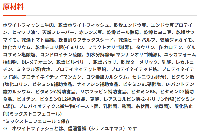 ホワイトフィッシュ生肉、乾燥ホワイトフィッシュ、乾燥エンドウ豆、エンドウ豆プロテイン、ヒマワリ油*、天然フレーバー、赤レンズ豆、乾燥ビール酵母、乾燥ヒヨコ豆、乾燥サツマイモ、乾燥トマト繊維、挽き割りフラックスシード、乾燥ビートパルプ、乾燥ジャガイモ、塩化カリウム、乾燥チコリ根(イヌリン、フラクトオリゴ糖源)、タウリン、β-カロテン、グルコサミン塩酸塩、コンドロイチン硫酸、加水分解酵母(マンナンオリゴ糖源)、ユッカフォーム抽出物、DL-メチオニン、乾燥ビルベリー、乾燥パセリ、乾燥ターメリック、乳酸、L-カルニチン、ミネラル類(食塩、プロテイネイテッド亜鉛、プロテイネイテッド鉄、プロテイネイテッド銅、プロテイネイテッドマンガン、ヨウ素酸カルシウム、セレニウム酵母)、ビタミン類(塩化コリン、ビタミンE補助食品、ナイアシン補助食品、ビタミンB1硝酸塩、D-パントテン酸カルシウム、ビタミンA補助食品、リボフラビン補助食品、ビタミンB6、ビタミンD3補助食品、ビオチン、ビタミンB12補助食品、葉酸、L-アスコルビン酸-2-ポリリン酸塩(ビタミンC源))、プロバイオティクス微生物(イースト菌、乳酸菌、麹菌、糸状菌、枯草菌)、酸化防止剤(ミックストコフェロール)