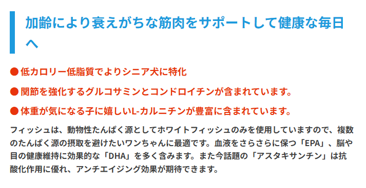 | ●低カロリー低脂質でよりシニア犬に特化 ●関節を強化するグルコサミンとコンドロイチンが含まれています ●体重が気になる子に嬉しいL-カルニチンが豊富に含まれています |