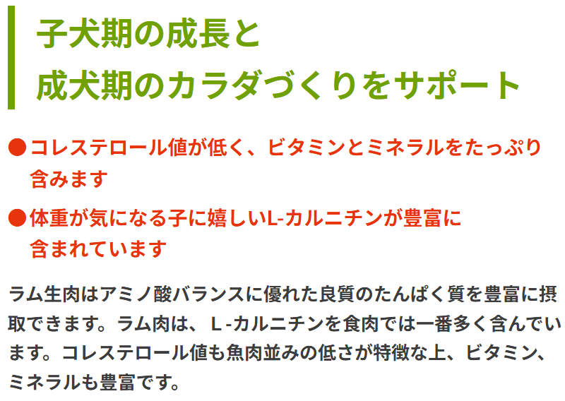 | 生まれた瞬間から肉食動物をルーツにもつ犬のカラダは多くのたんぱく質を求めています。たんぱく質を十分にとることは成長過程の様々なことに大きく貢献します。 |