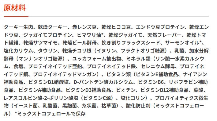 ターキー生肉、乾燥ターキー、赤レンズ豆、乾燥ヒヨコ豆、エンドウ豆プロテイン、乾燥エンドウ豆、ジャガイモプロテイン、ヒマワリ油*、乾燥ジャガイモ、天然フレーバー、乾燥トマト繊維、乾燥サツマイモ、乾燥ビール酵母、挽き割りフラックスシード、サーモンオイル*、タウリン、乾燥チコリ根(イヌリン、フラクトオリゴ糖源)、乳酸、加水分解酵母(マンナンオリゴ糖源)、ユッカフォーム抽出物、セレニウム酵母、ミネラル類(リン酸一水素カルシウム、食塩、亜鉛、鉄、銅、コバルト、マンガン、ヨウ素酸カルシウム、亜セレン酸ナトリウム、塩化カリウム)、ビタミン類(ビタミンE補助食品、ナイアシン補助食品、ビタミンB1硝酸塩、D-パントテン酸カルシウム、ビタミンB6、リボフラビン補助食品、ビタミンA補助食品、ビタミンD3補助食品、ビオチン、ビタミンB12補助食品、葉酸、L-アスコルビン酸-2-ポリリン酸塩(ビタミンC源)、塩化コリン)、プロバイオティクス微生物(イースト菌、乳酸菌、黒麹菌、糸状菌、枯草菌)、酸化防止剤(ミックストコフェロール)