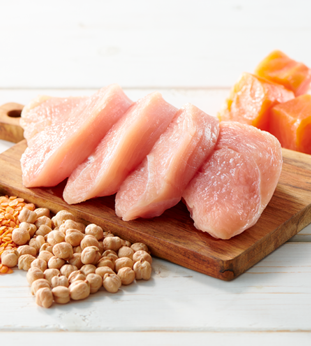 ターキーは他の肉類に比べ脂肪、コレステロール分が少なく、たんぱく質が豊富で消化に優れています。チキンとターキーはアレルギーを誘発する抗原が異なるため、チキンアレルギーのワンちゃんにも安心して与えることができます。また、チキンに比べ、セレン等のミネラルをより多く含みます。
