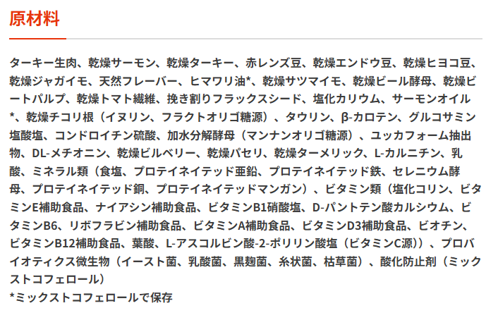 ターキー生肉、乾燥サーモン、乾燥ターキー、赤レンズ豆、乾燥エンドウ豆、乾燥ヒヨコ豆、乾燥ジャガイモ、天然フレーバー、ヒマワリ油*、乾燥サツマイモ、乾燥ビール酵母、乾燥ビートパルプ、乾燥トマト繊維、挽き割りフラックスシード、塩化カリウム、サーモンオイル*、乾燥チコリ根(イヌリン、フラクトオリゴ糖源)、タウリン、β-カロテン、グルコサミン塩酸塩、コンドロイチン硫酸、加水分解酵母(マンナンオリゴ糖源)、ユッカフォーム抽出物、DL-メチオニン、乾燥ビルベリー、乾燥パセリ、乾燥ターメリック、L-カルニチン、乳酸、ミネラル類(食塩、プロテイネイテッド亜鉛、プロテイネイテッド鉄、セレニウム酵母、プロテイネイテッド銅、プロテイネイテッドマンガン)、ビタミン類(塩化コリン、ビタミンE補助食品、ナイアシン補助食品、ビタミンB1硝酸塩、D-パントテン酸カルシウム、ビタミンB6、リボフラビン補助食品、ビタミンA補助食品、ビタミンD3補助食品、ビオチン、ビタミンB12補助食品、葉酸、L-アスコルビン酸-2-ポリリン酸塩(ビタミンC源))、プロバイオティクス微生物(イースト菌、乳酸菌、黒麹菌、糸状菌、枯草菌)、酸化防止剤(ミックストコフェロール)