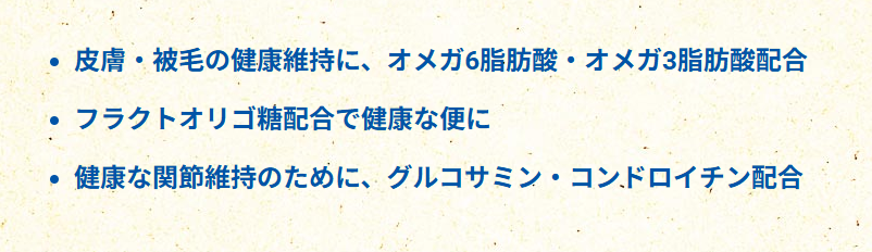 ●コエンザイムQ10 健康な皮膚と被毛、免疫力を維持 ●クランベリー ポリフェノールを多く含み、尿路の健康を維持 ●合成保存料無添加、無着色・無香料 ●オメガ6脂肪酸・オメガ3脂肪酸 皮膚や被毛の健康維持のために ●フラクトオリゴ糖 腸内フローラを整え健康な便に ●ミルクプロテイン 健康な筋肉の維持に配慮 ●グルコサミン・コンドロイチン 関節の健康維持のために |