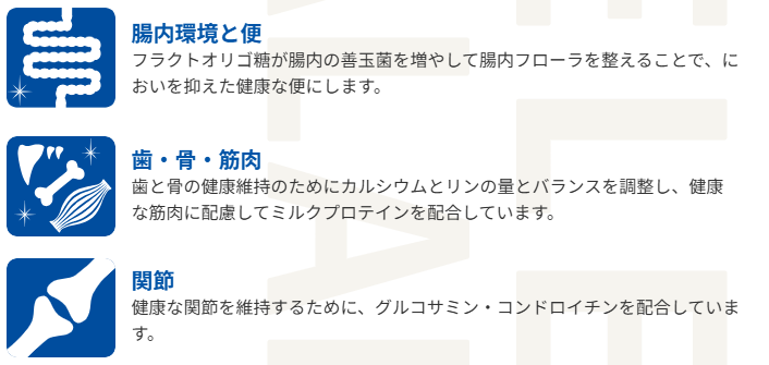 ●コエンザイムQ10 健康な皮膚と被毛、免疫力を維持 ●クランベリー ポリフェノールを多く含み、尿路の健康を維持 ●合成保存料無添加、無着色・無香料 ●オメガ6脂肪酸・オメガ3脂肪酸 皮膚や被毛の健康維持のために ●フラクトオリゴ糖 腸内フローラを整え健康な便に ●ミルクプロテイン 健康な筋肉の維持に配慮 ●グルコサミン・コンドロイチン 関節の健康維持のために |