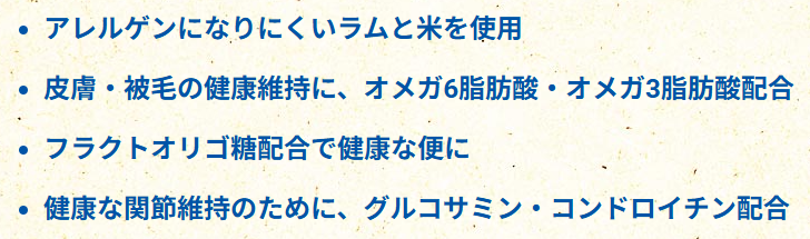 乾燥ラム、玄米、米、エンドウ豆プロテイン、ビートパルプ、鶏脂(オメガ6脂肪酸・オメガ3脂肪酸源)、チキンエキス、乾燥ミルクプロテイン、ビール酵母、エンドウ豆繊維、クランベリー、フラクトオリゴ糖、グルコサミン、コンドロイチン、コエンザイムQ10、ビタミン類(A、D、E、B1、B2、B6、B12、ナイアシン、パントテン酸、葉酸、ビオチン、コリン)、ミネラル類(カルシウム、カリウム、ナトリウム、クロライド、硫酸亜鉛、鉄、銅、マンガン、セレン、ヨウ素)、酸化防止剤(ミックストコフェロール、クエン酸、ローズマリー抽出物)