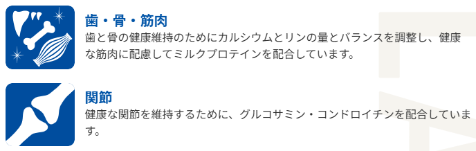 適切なレベルのカルシウムとリンやミルクプロテインを配合することで、骨と歯の健康を維持します。