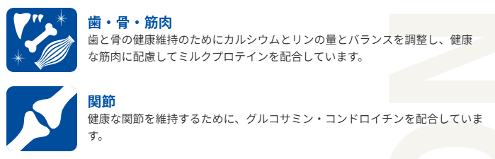 適切なレベルのカルシウムとリンやミルクプロテインを配合することで、骨と歯の健康を維持します。