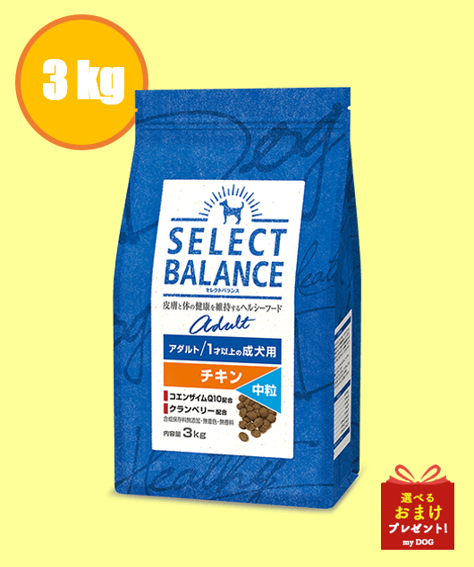 セレクトバランス ハイクォリティーフード アダルトチキンは、生後1才以上の成犬に適正な体重と健康を維持するのに必要な栄養をバランスよく配合しました。