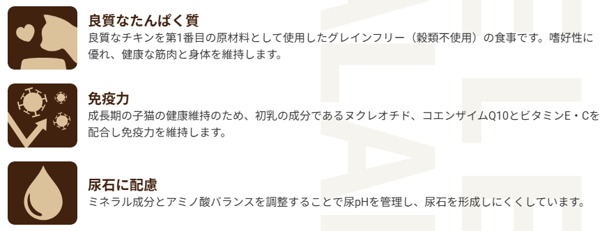 成長期の子猫の健康維持のため、初乳の成分であるヌクレオチド、コエンザイムQ10とビタミンE・Cを配合し免疫力を維持します。