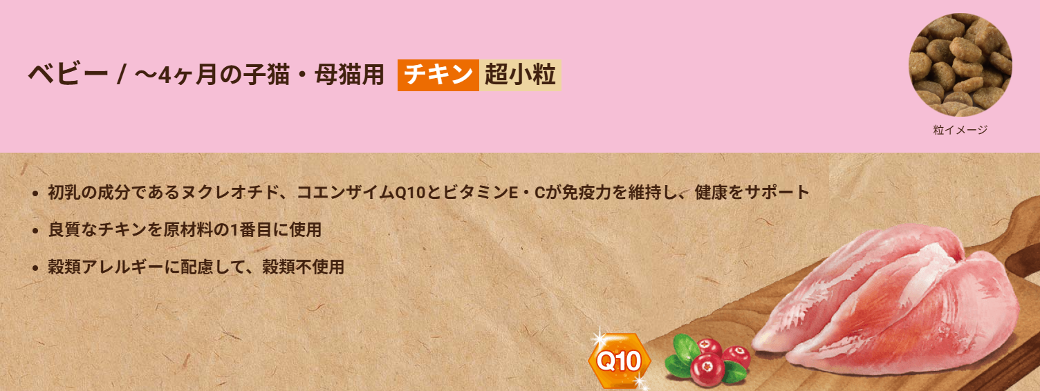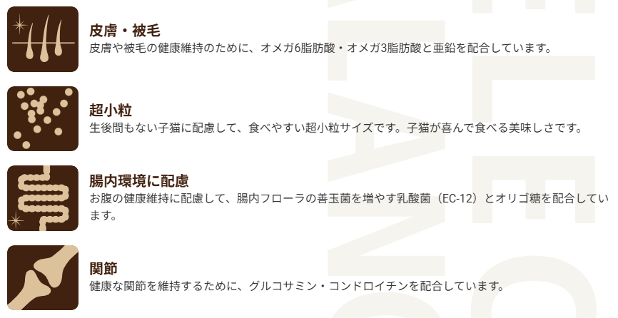 生後間もない子猫に配慮して、食べやすい超小粒サイズです。子猫が喜んで食べる美味しさです。