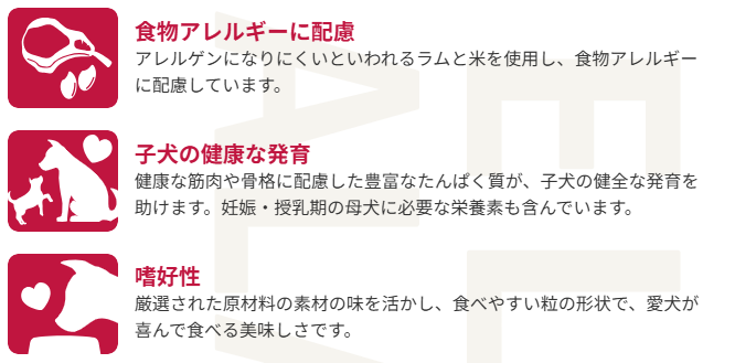 育ちざかりの仔犬に必要な栄養素をバランスよく配合。