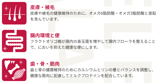 ●コエンザイムQ10 健康な皮膚と被毛、免疫力を維持 ●クランベリー ポリフェノールを多く含み、尿路の健康を維持 ●合成保存料無添加、無着色・無香料 ●オメガ6脂肪酸・オメガ3脂肪酸 皮膚や被毛の健康維持のために ●フラクトオリゴ糖 腸内フローラを整え健康な便に ●ミルクプロテイン 健康な筋肉の維持に配慮 ●グルコサミン・コンドロイチン 関節の健康維持のために |