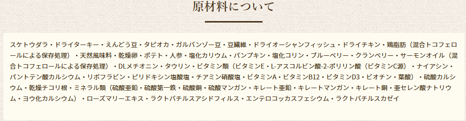 スケトウダラ・ドライターキー・えんどう豆・タピオカ・ガルバンゾー豆・豆繊維・ドライオーシャンフィッシュ・ドライチキン・鶏脂肪(混合トコフェロールによる保存処理)・天然風味料・乾燥卵・ポテト・人参・塩化カリウム・パンプキン・塩化コリン・ブルーベリー・クランベリー・サーモンオイル(混合トコフェロールによる保存処理)・DLメチオニン・タウリン・ビタミン類(ビタミンE・L-アスコルビン酸-2-ポリリン酸(ビタミンC源)・ナイアシン・パントテン酸カルシウム・リボフラビン・ピリドキシン塩酸塩・チアミン硝酸塩・ビタミンA・ビタミンB12・ビタミンD3・ビオチン・葉酸)・硫酸カルシウム・乾燥チコリ根・ミネラル類(硫酸亜鉛・硫酸第一鉄・硫酸銅・硫酸マンガン・キレート亜鉛・キレートマンガン・キレート銅・亜セレン酸ナトリウム・ヨウ化カルシウム)・ローズマリーエキス・ラクトバチルスアシドフィルス・エンテロコッカスフェシウム・ラクトバチルスカゼイ