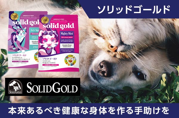 | 体を一つ一つのパーツとしてとらえるのではなく、体全体が、お互いに作用しあっているのだと考えています。 「本来あるべき健康な身体を作る手助けをしたい」 それがソリッドゴールドの哲学です。 ●化学物質、小麦、コーン、大豆不使用 ●ドライフードにサーモンオイル・タウリン配合 |