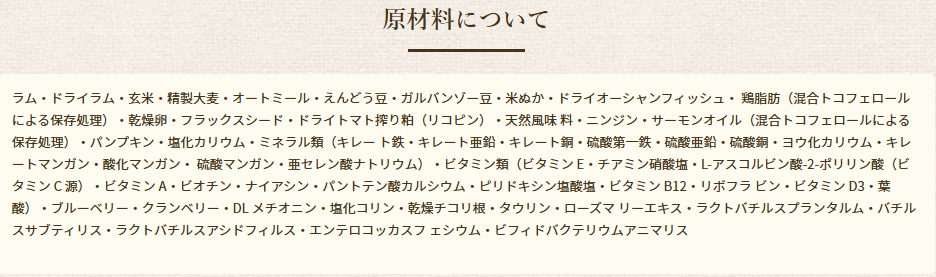 ラム・ラムミール・玄米・挽き割り精製大麦・黍・米ぬか・オートミール・オーシャンフィッシュミール・キャノーラ油(混合トコフェロールによる保存処理)・トマト絞り粕・フラックスシード・天然風味料・サーモン油(DHA源)・塩化コリン・タウリン・乾燥チコリ根・パセリフレーク・パンプキンミール・アーモンド油(混合トコフェロールによる保存処理)・ゴマ油・ユッカシジゲラエキス・タイム・ブルーベリー・クランベリー・ニンジン・ブロッコリー・ビタミンE・鉄(アミノ酸キレート)・亜鉛(アミノ酸キレート)・銅(アミノ酸キレート)・硫酸第一鉄・硫酸銅・ヨウ化カリウム・チアミン塩酸塩・マンガン(アミノ酸キレート)・酸化マンガン・アスコルビン酸・ビタミンA・ビオチン・カルシウムパントテン酸塩・硫酸マンガン・亜セレン酸ナトリウム・ピリドキシン塩酸塩(ビタミンB6)・ビタミンB12・リボフラビン・ビタミンD追加物・葉酸