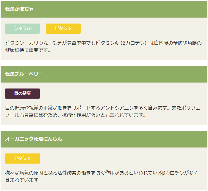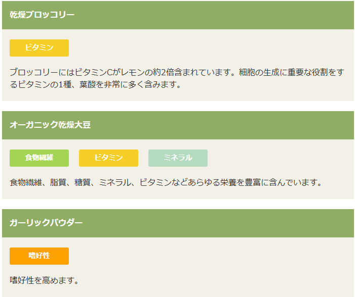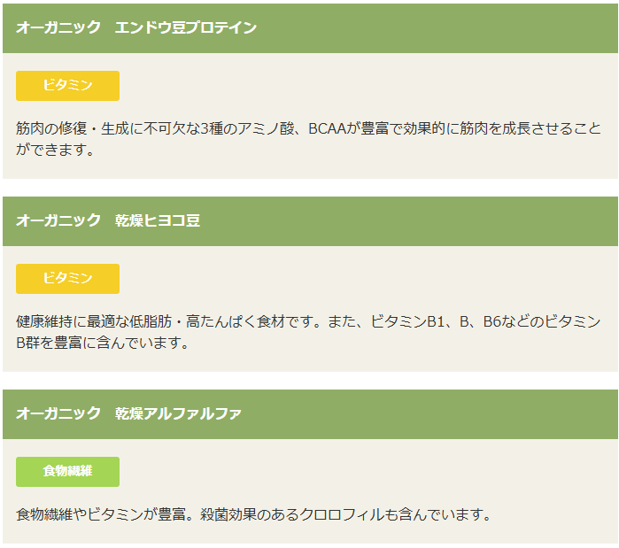 オーガニックチキン生肉、乾燥チキン、オーガニック乾燥豆類、オーガニックエンドウ豆粉、オーガニックエンドウ豆プロテイン、オーガニック乾燥ヒヨコ豆、オーガニックタピオカ粉、オーガニック乾燥アルファルファ、オーガニックひまわり油*、天然フレーバー、オーガニック挽き割りフラックスシード、オーガニック乾燥ジャガイモ、鶏脂肪*、乾燥サーモン、エンドウ豆でんぷん、乾燥トマト繊維、乾燥レンズ豆、塩化カリウム、乾燥ビール酵母、サーモンオイル*、ミネラル類(亜鉛、鉄、銅、コバルト、マンガン、食塩、ヨウ素酸カルシウム、亜セレン酸ナトリウム)、タウリン、オーガニックひまわりの種、乾燥かぼちゃ、乾燥ブルーベリー、オーガニック乾燥にんじん、乾燥ブロッコリー、オーガニック乾燥大豆、加水分解酵母(マンナンオリゴ糖源)、ビタミン類(塩化コリン、ビタミンE補助食品、ナイアシン補助食品、ビタミンB1硝酸塩、Dーパントテン酸カルシウム、ビタミンB6、リボフラビン補助食品、ビタミンA補助食品、ビタミンD3補助食品、ビオチン、ビタミンB12補助食品、葉酸)、乾燥チコリ根(イヌリン、フラクトオリゴ糖源)、乾燥セージ、乳酸、ユッカフォーム抽出物、ガーリックパウダー、プロバイオティクス微生物(イースト菌、乳酸菌、麹菌、糸状菌、枯草菌)、酸化防止剤(ミックストコフェロール)