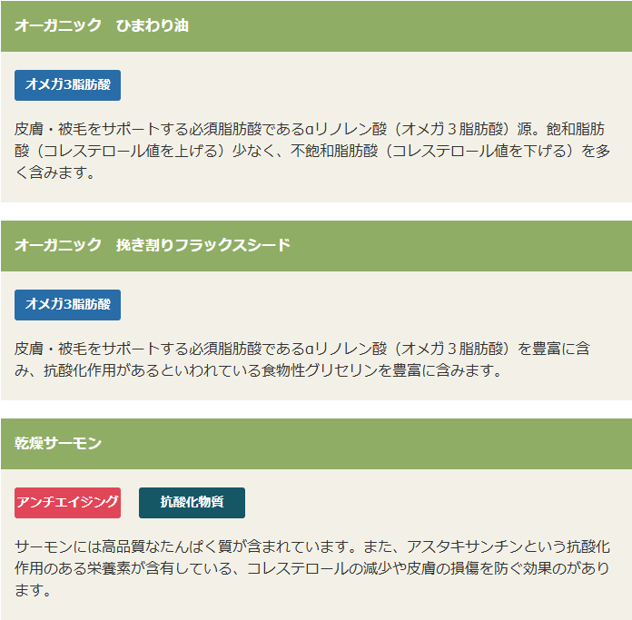 | (1)主原料がオーガニック (2)グレインフリー(穀物不使用) (3)腸内環境の改善 (4)必須脂肪酸で美しい皮膚、つややかな被毛に (5)ミネラル吸収率アップ (6)天然由来の酸化防止剤 (7)高たんぱく・低脂肪 |