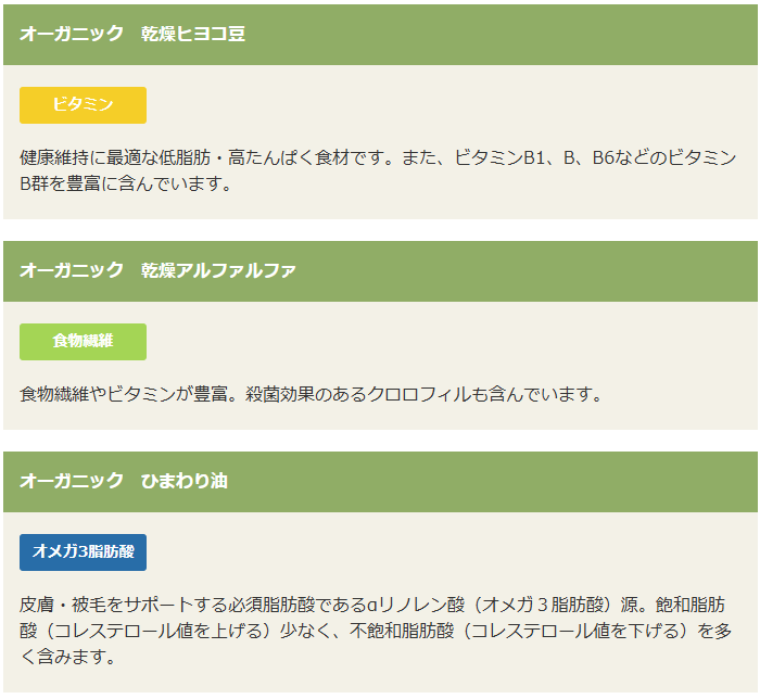 | (1)主原料がオーガニック (2)グレインフリー(穀物不使用) (3)腸内環境の改善 (4)必須脂肪酸で美しい皮膚、つややかな被毛に (5)ミネラル吸収率アップ (6)天然由来の酸化防止剤 (7)高たんぱく・低脂肪 |