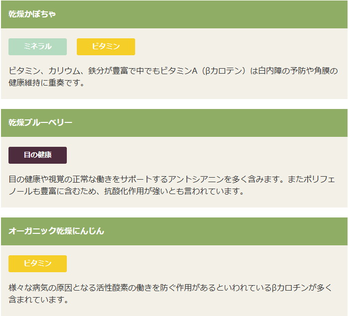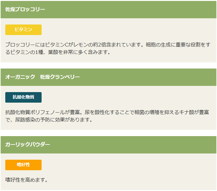 オーガニックターキー生肉、乾燥ターキー、オーガニック乾燥豆類、オーガニックエンドウ豆粉、オーガニックタピオカ粉、オーガニック乾燥ヒヨコ豆、オーガニック乾燥アルファルファ、天然フレーバー、オーガニック挽き割りフラックスシード、キャノーラ油、オーガニック乾燥ジャガイモ、オーガニックひまわり油*、リン酸三カルシウム、乾燥サーモン、乾燥トマト繊維、オーガニック乾燥ケルプ、オーガニック乾燥リンゴ、乾燥レンズ豆、塩化カリウム、乾燥ビール酵母、サーモンオイル*、サメ軟骨(グルコサミン、コンドロイチン源)、エンドウ豆でんぷん、ミネラル類(亜鉛、鉄、銅、コバルト、マンガン、食塩、ヨウ素酸カルシウム、亜セレン酸ナトリウム)、タウリン、オーガニックひまわりの種、乾燥かぼちゃ、乾燥ブルーベリー、オーガニック乾燥にんじん、乾燥ブロッコリー、加水分解酵母(マンナンオリゴ糖源)、ビタミン類(塩化コリン、ビタミンE補助食品、ナイアシン補助食品、ビタミンB1硝酸塩、Dーパントテン酸カルシウム、ビタミンB6、リボフラビン補助食品、ビタミンA補助食品、ビタミンD3補助食品、ビオチン、ビタミンB12補助食品、葉酸)、オーガニック乾燥クランベリー、乾燥チコリ根(イヌリン、フラクトオリゴ糖源)、乾燥セージ、乳酸、ユッカフォーム抽出物、ガーリックパウダー、プロバイオティクス微生物(イースト菌、乳酸菌、麹菌、糸状菌、枯草菌)酸化防止剤(ミックストコフェロール) *ミックストコフェロールで保存
