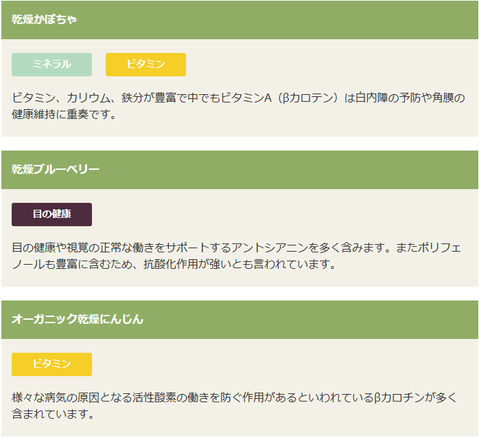 オーガニックチキン生肉、乾燥チキン、オーガニック乾燥豆類、オーガニック乾燥ヒヨコ豆、オーガニックエンドウ豆粉、オーガニックタピオカ粉、オーガニック乾燥アルファルファ、天然フレーバー、オーガニック乾燥ジャガイモ、オーガニック挽き割りフラックスシード、乾燥サーモン、エンドウ豆でんぷん、食塩、オーガニックひまわり油*、乾燥トマト繊維、オーガニック乾燥ケルプ、オーガニック乾燥リンゴ、塩化カリウム、乾燥ビール酵母、サーモンオイル*、チキン軟骨(グルコサミン、コンドロイチン源)、ミネラル類(亜鉛、鉄、銅、コバルト、マンガン、ヨウ素酸カルシウム、亜セレン酸ナトリウム)、タウリン、オーガニックひまわりの種、乾燥かぼちゃ、乾燥ブルーベリー、オーガニック乾燥にんじん、乾燥ブロッコリー、加水分解酵母(マンナンオリゴ糖源)、ビタミン類(塩化コリン、ビタミンE補助食品、ナイアシン補助食品、ビタミンB1硝酸塩、Dーパントテン酸カルシウム、ビタミンB6、リボフラビン補助食品、ビタミンA補助食品、ビタミンD3補助食品、ビオチン、ビタミンB12補助食品、葉酸)、オーガニック乾燥クランベリー、乾燥チコリ根(イヌリン、フラクトオリゴ糖源)、乾燥セージ、Lーカルニチン、乳酸、ユッカフォーム抽出物、ガーリックパウダー、プロバイオティクス微生物(イースト菌、乳酸菌、麹菌、糸状菌、枯草菌)、酸化防止剤(ミックストコフェロール) *ミックストコフェロールで保存